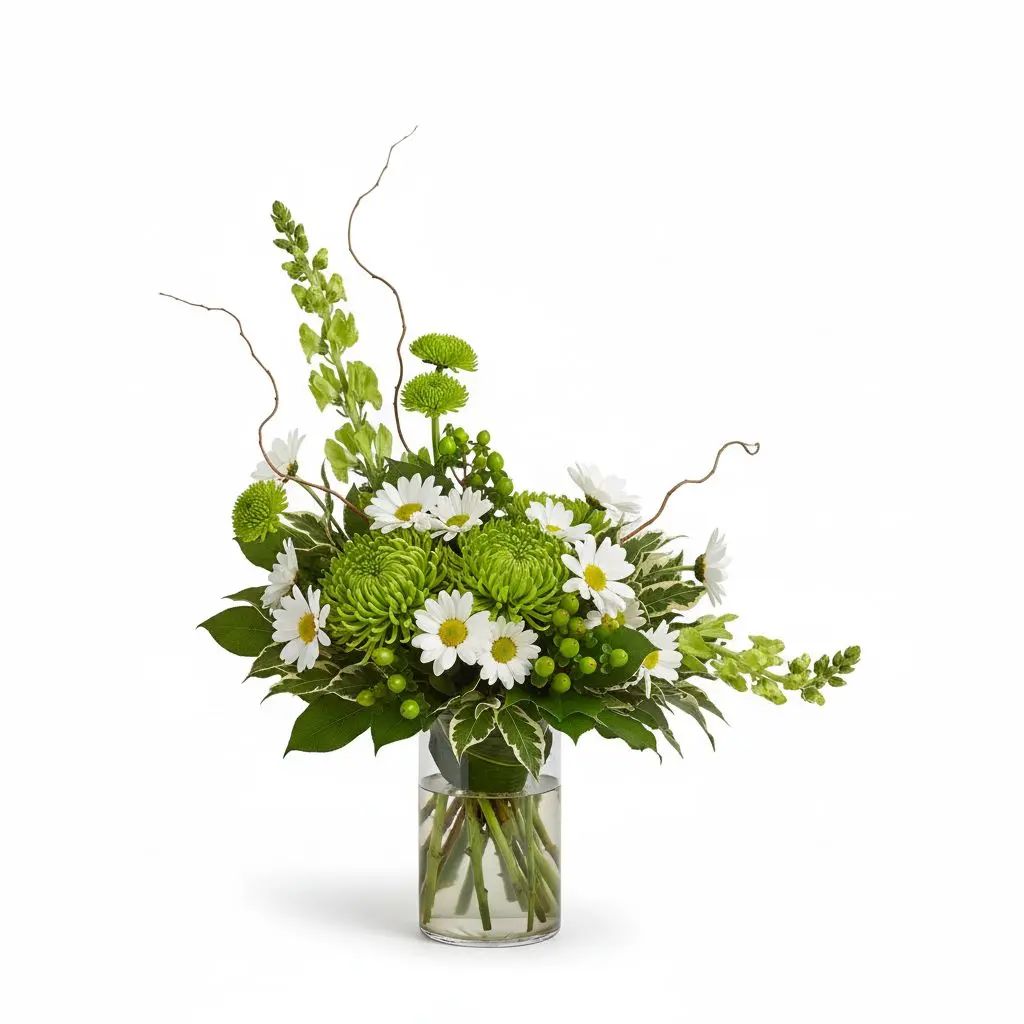 Imagine the vibrant greenery and fresh blooms of an Irish garden brought to your home. This delightful arrangement features cheerful daisy poms, elegant spider mums, and stately bells of Ireland, creating a feeling of joyful tranquility. Accented with rich hypericum berries and lush greens, it's a perfect gift to brighten any day.