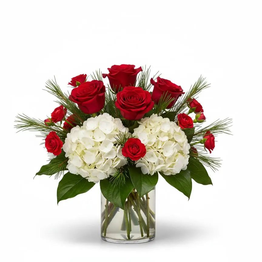 Embrace the breathtaking beauty of the "Forest Bloom Grandeur" arrangement, a stunning display of vibrant hydrangeas, roses, and spray roses. Accented with fresh pine and galex, it evokes the serene elegance of a blossoming forest. This exquisite bouquet is a perfect way to celebrate joy and bring nature's splendor indoors.